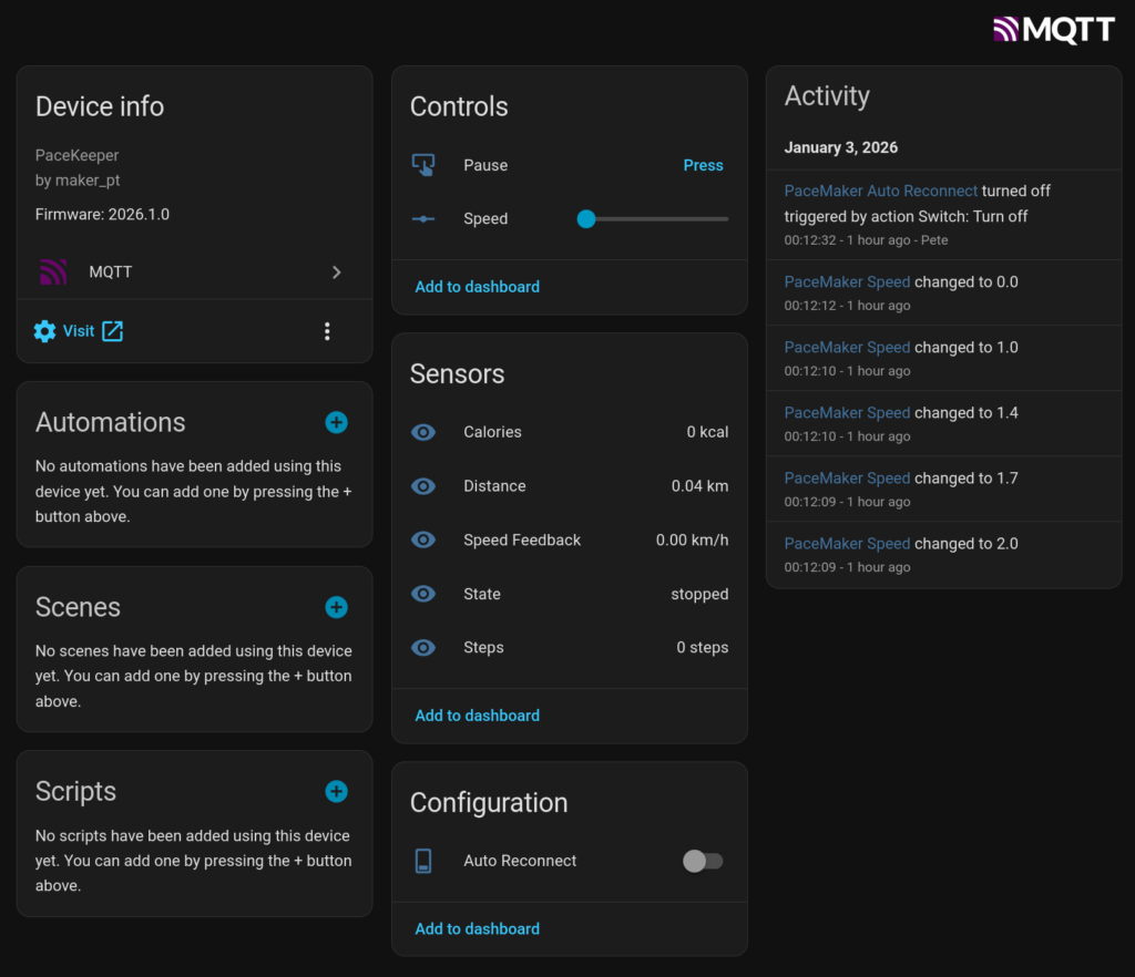 PaceKeeper is an ESP32 bridge that connects via Bluetooth to your WalkingPad and exposes the device via MQTT to Home Assistant.